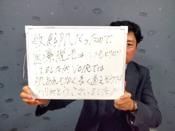 「敏感肌だったので、医療脱毛はいつもヒリヒリしていましたが、VOIRでは肌荒れなく長く通えそうです。ありがとうございました!!」